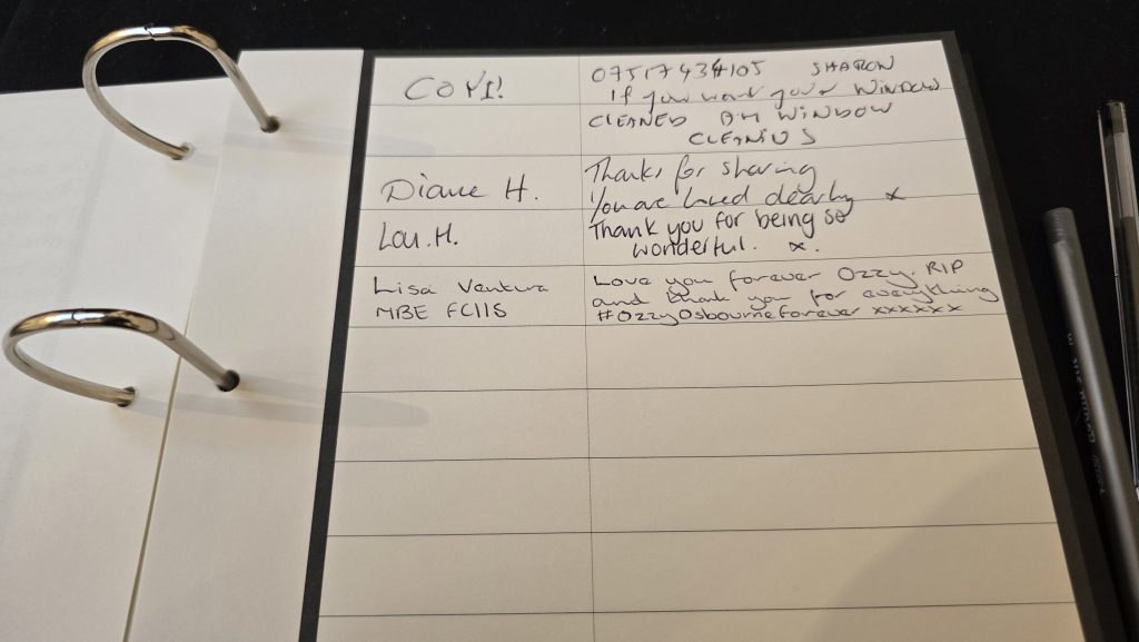 While there, I joined the queue to sign the book of condolence that has been opened up for Ozzy’s family. What struck me was how patient and respectful everyone in the queue was, it was full of heavy metal fans (you could tell by the Tshirts and attire they were wearing) and while metal has a reputation of the fans being thugs or lairy, there was nothing of the sort today. Everyone was here for the same thing, to pay tribute to Ozzy, I even got chatting to a few people in the queue where we shared our memories of Ozzy and Black Sabbath. Heavy metal fans are a true community.